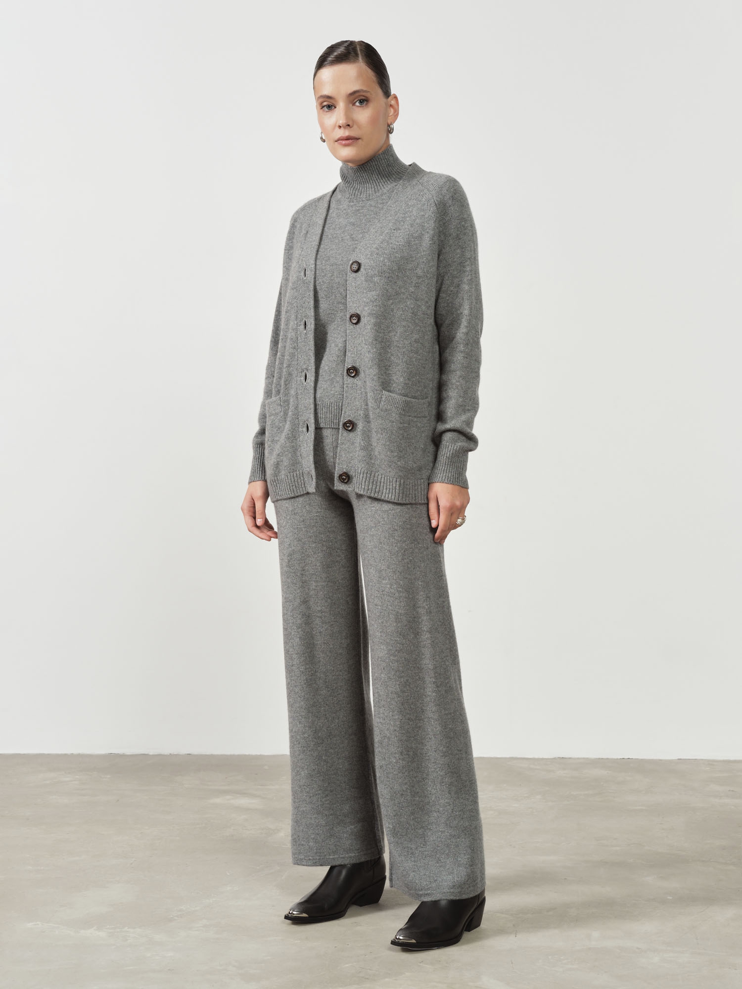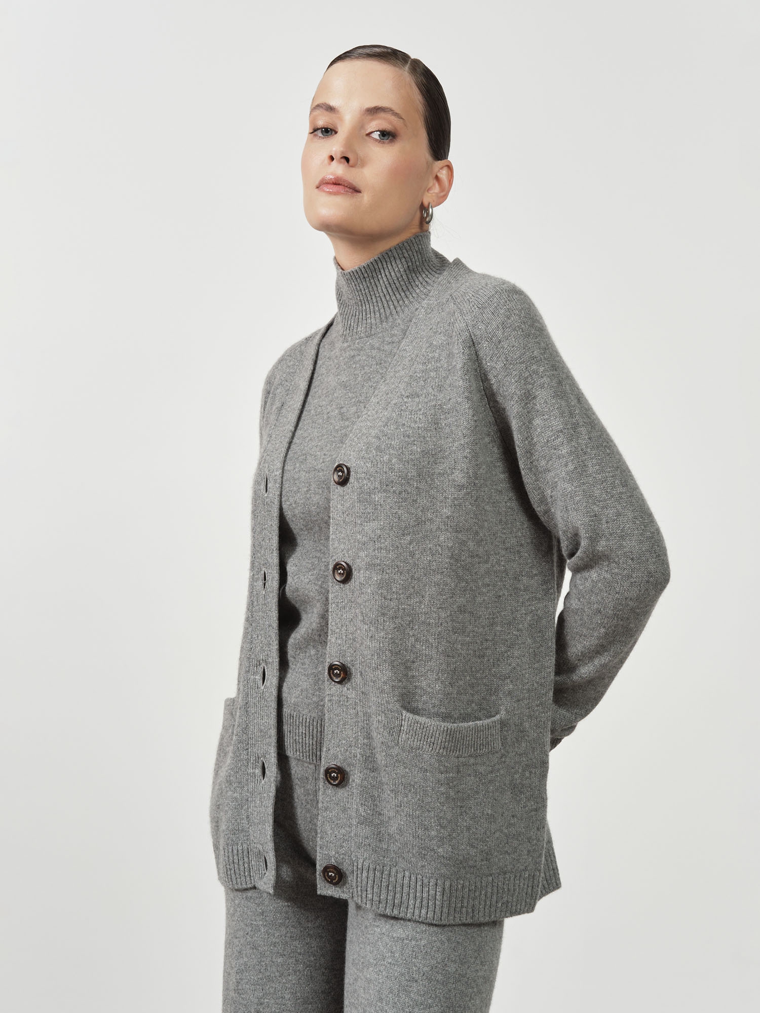 Модель выполнена с V-образным вырезом и застёжкой на пуговицы. Прямой крой и минималистичный стиль делают кардиган универсальным и практичным.